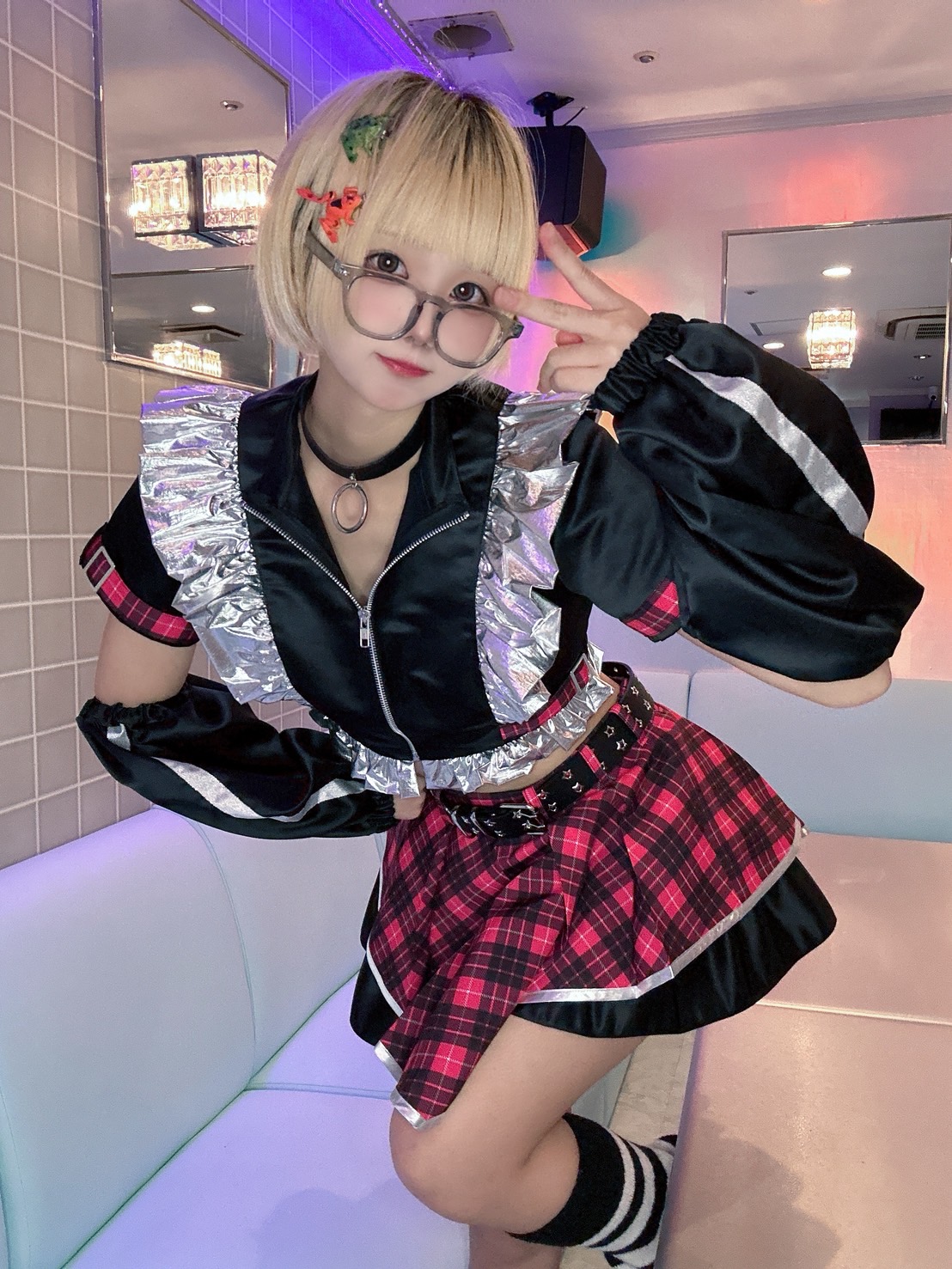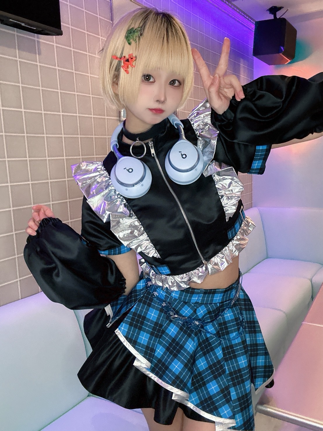黒を基調とした生地に差し色で水色とピンクのネオンカラーの衣装!