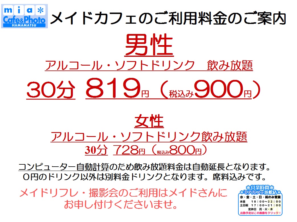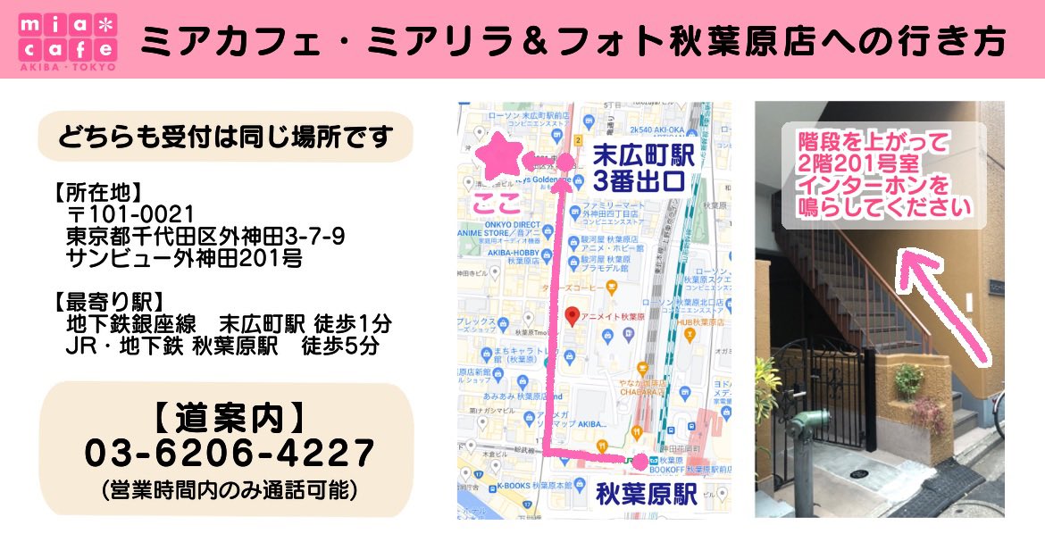 | アクセス | 静岡駅8分・浜松駅7分・甲府駅7分 【ミアカフェ静岡北口2号店】 ●メイドカフェ 静岡市葵区両替町1-5-7 光進両替町ビル403 伊勢丹すぐ横! 【ミアリラ&フォト静岡北口店】 ●リフレ&撮影会 静岡市葵区七間町3-4 七間町ハイム506 【ミアカフェ山梨店】 甲府市丸の内1-15-8 三星ビル3階 ココリ目の前のビル 【ミアカフェ&フォト浜松店】 浜松市中区連尺町314-36チサンマンション連尺1004 浜松駅7分 |