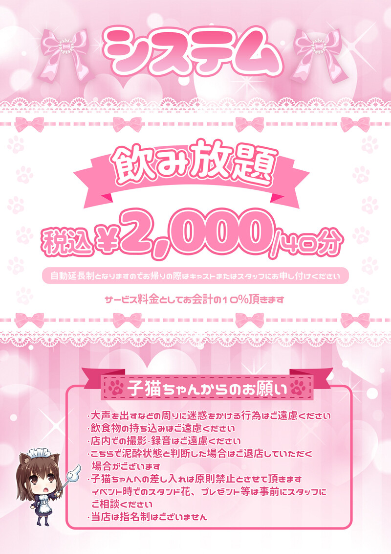 | 特典・サービス | オリジナルグッズ/ オリジナル制服/ チェキ、写真が撮れる/ 指名が出来る/ クーポン有り/ メイド服に着替えられる/ ポイントカードあり |